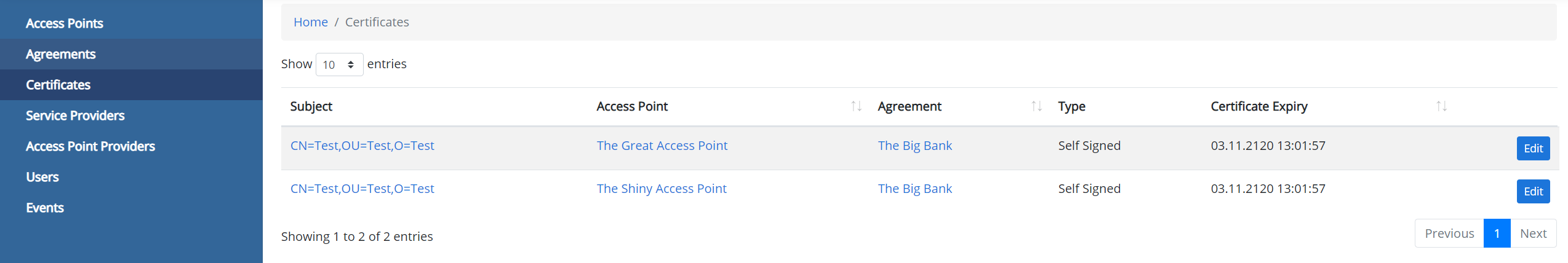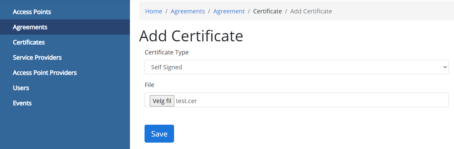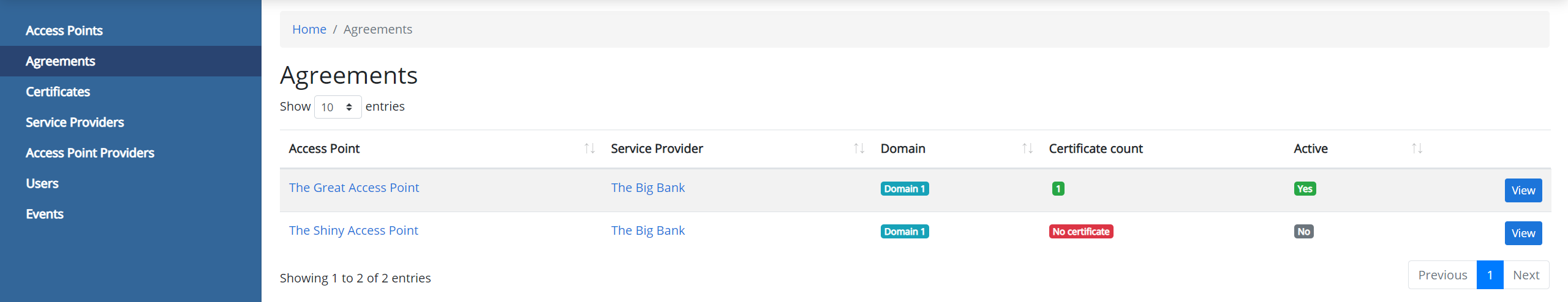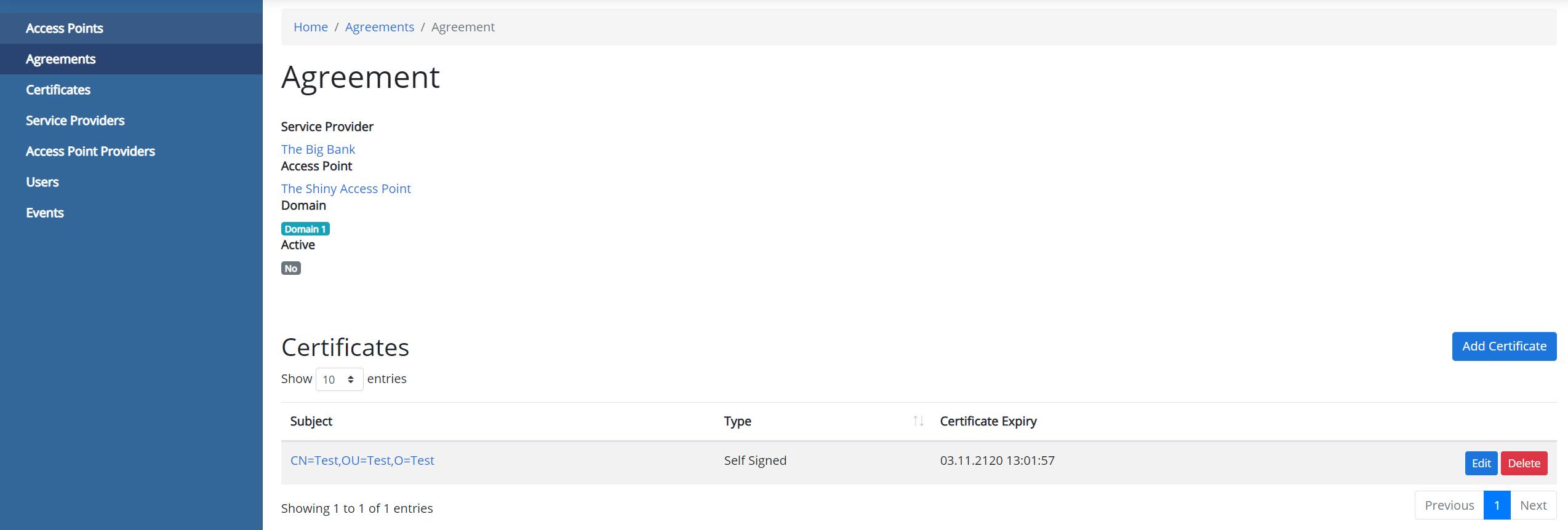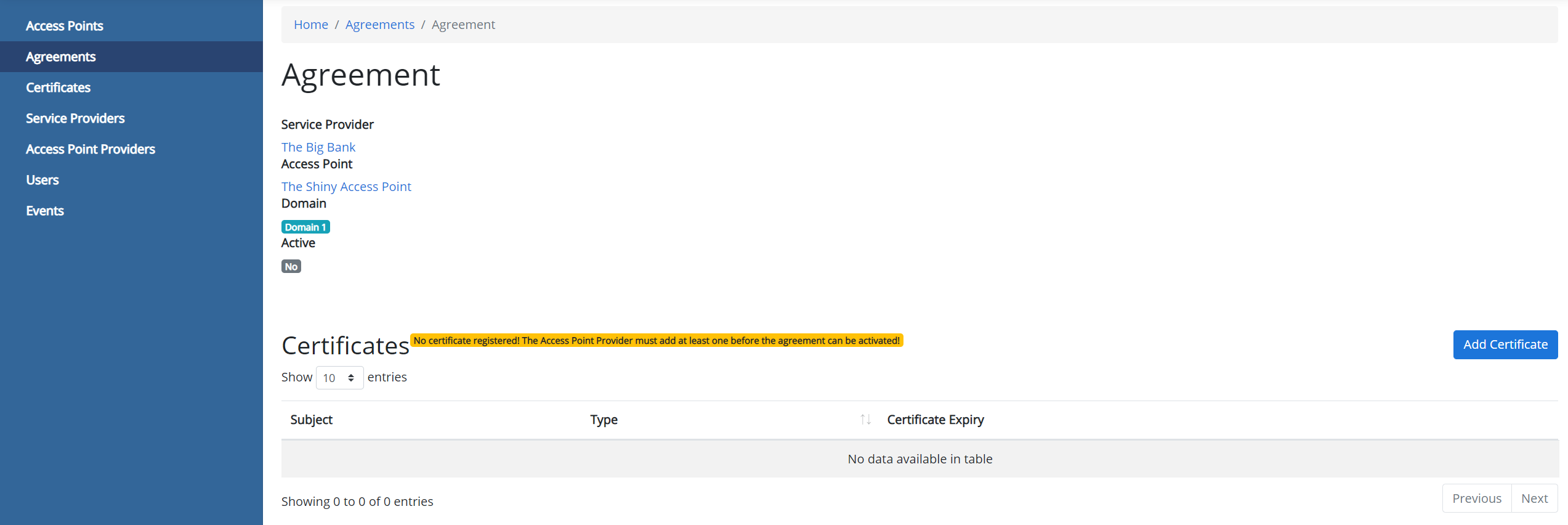 This is where you can see all the certificates belonging to one or more agreements. To add, update or delete a certificate, you need to go to select an agreement first.