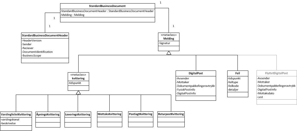 - Den andre er Meldingsklassen som enten er av typen Digitalpost, Feil eller Kvittering. Kvittering kan være av typen VarslingfeiletKvittering, Åpningskvittering eller LeveringsKvittering.